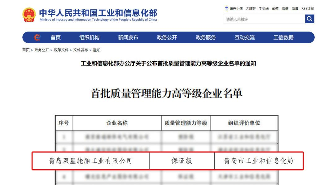 行業(yè)唯一!雙星輪胎入選工信部質(zhì)量管理能力高等級(jí)企業(yè)名單